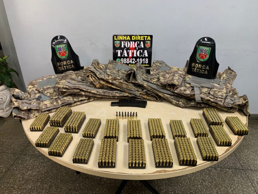 Segundo a Polícia Militar, os agentes foram até o local indicado e localizaram uma residência onde o armamento estaria escondido. Dentro do imóvel, foram apreendidas duas pistolas, cinco coletes balísticos e cerca de mil munições, material que, conforme as investigações iniciais, seria utilizado em um embate com um grupo rival ainda neste fim de semana.