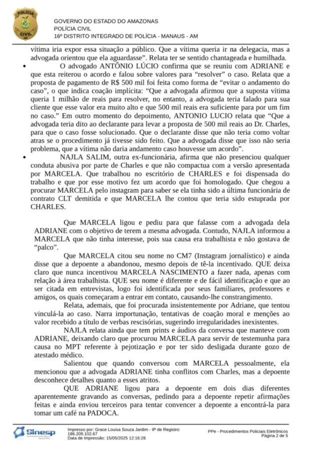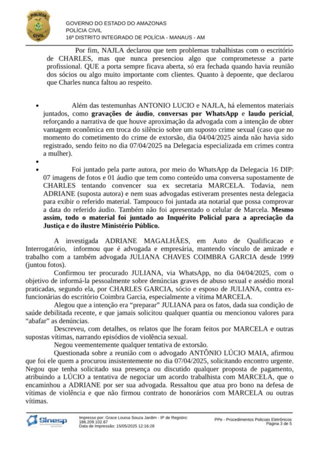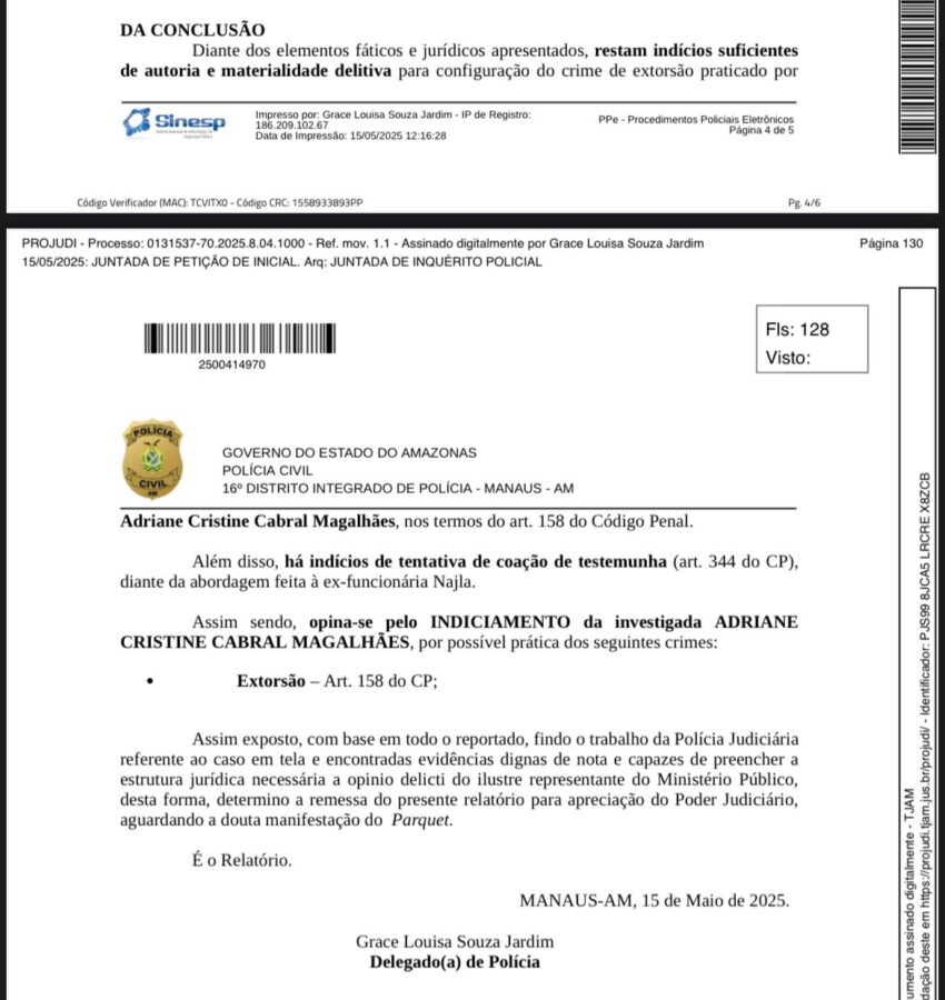 O inquérito policial, que agora será encaminhado ao Ministério Público do Amazonas (MP-AM), inclui áudios, mensagens de texto e depoimentos de testemunhas que reforçam a versão de que a advogada, Adriane Magalhães teria tentado negociar o silêncio da vítima.