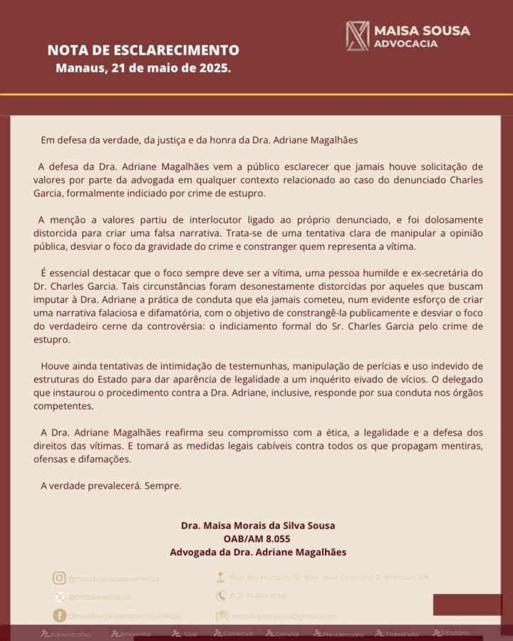 Adriane Magalhães nega veementemente as acusações e afirma que a denúncia é uma tentativa de intimidação, comum em casos de violência sexual.