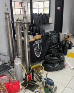 Além dos entorpecentes, os policiais encontraram materiais utilizados no preparo e adulteração da droga, como xarope de glicose de milho, pó de casca de laranja, cilindros de gás butano (47 unidades da marca Bullfire), uma prensa hidráulica, um compressor de ar, uma balança de precisão e um cilindro de nitrogênio — este último com possível uso em processos químicos.