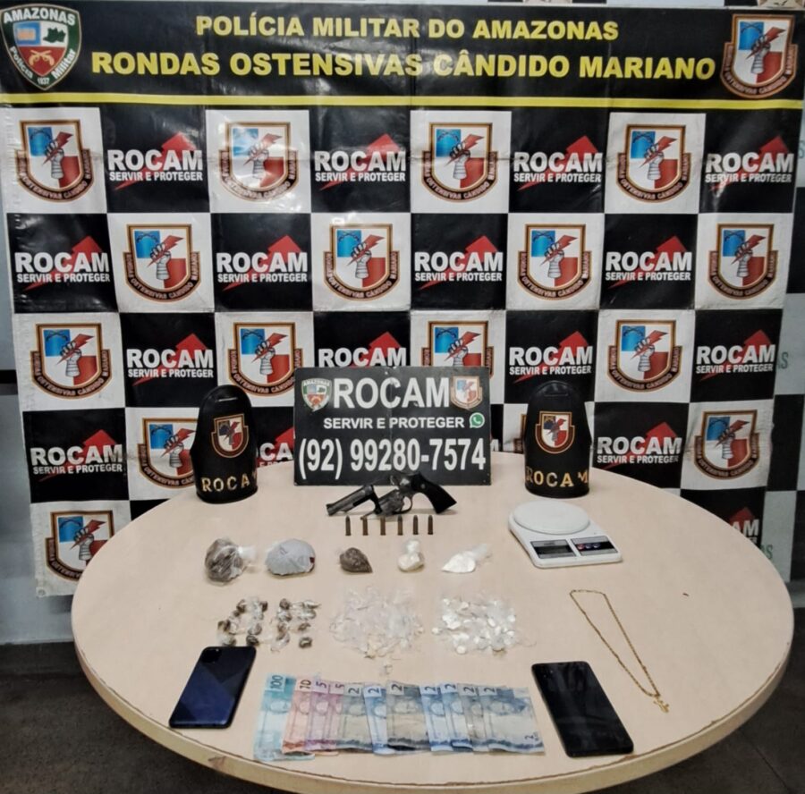 Um jovem de 19 anos foi preso na tarde desta quinta-feira (04/07) por porte ilegal de arma de fogo e posse de entorpecentes no bairro Praça 14 de Janeiro, zona sul de Manaus. A ação foi realizada por policiais da Rondas Ostensivas Cândido Mariano (ROCAM), vinculada ao Comando de Policiamento Especializado da Polícia Militar do Amazonas.