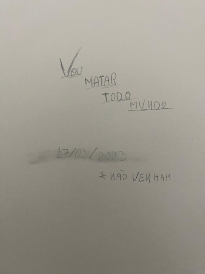 “Vou matar todo mundo. Não venham”, dizia o aviso na parede do banheiro com a data desta sexta-feira (17).