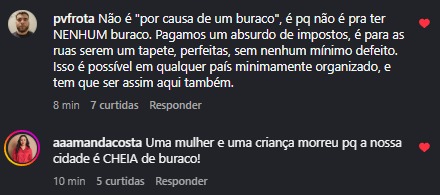 “Não é ‘por causa de um buraco’, é pq não é pra ter NENHUM buraco. Pagamos um absurdo de impostos, é para as ruas serem um tapete, perfeitas, sem nenhum mínimo defeito. Isso é possível em qualquer país minimamente organizado, e tem que ser assim aqui também”, disse um internauta.