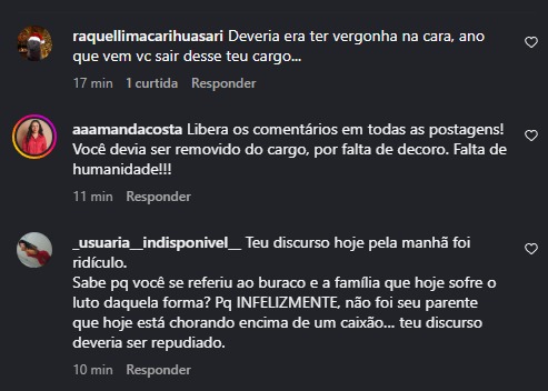 “Sabe pq você se referiu ao buraco e a família que hoje sofre o luto daquela forma? Pq INFELIZMENTE, não foi seu parente que hoje está chorando encima de um caixão… teu discurso deveria ser repudiado.”, escreveu outra mulher.