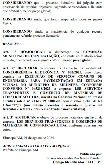 O Diário Oficial dos Municípios (DOM) desta quarta-feira (06/08), mostra que a Professora Áurea Marques contratou a empresa L.S.B. SERVIÇOS TRANSPORTES E COMÉRCIO DE MATERIAIS DE CONSTRUÇÃO LTDA, que vai receber o valor de R$ 1.364.372,39 (um milhão trezentos e sessenta e quatro mil trezentos e setenta e dois reais e trinta e nove centavos), para a pavimentação de uma estrada vicinal.