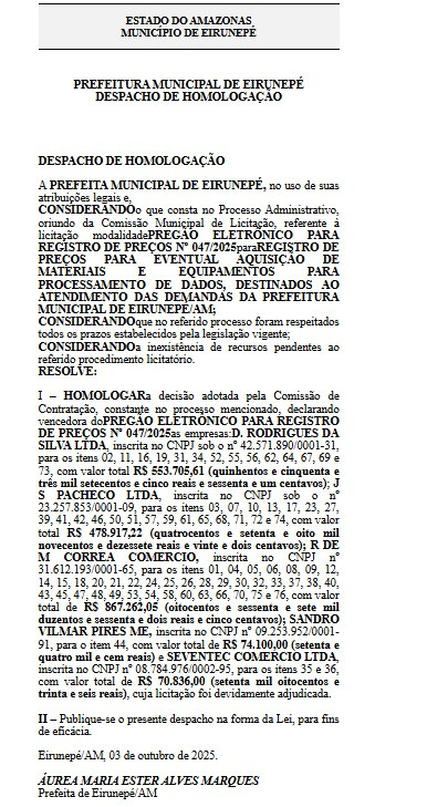 Além do alto valor empregado nos contratos, o que chama a atenção é que a Prefeitura de Eirunepé e sua gestora, prefeita Professora Áurea Marques, não especificam quais serão os materiais adquiridos pela gestão pública, o que levanta questionamentos sobre a licitude desta licitação.