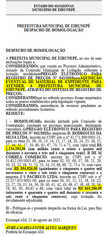 De acordo com o Diário Oficial dos Municípios (DOM), a prefeita Professora Áurea Marques contratou três empresas para fornecer material de expediente para a Prefeitura de Eirunepé.