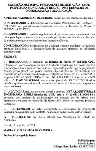Sem dar maiores informações no Diário Oficial da Associação Amazonense dos Municípios (AAM), o contrato para a pavimentação de ruas, foi homologado nesta segunda-feira (17), mas não diz quais são as ruas beneficiadas, ou os bairros que deverão receber o serviço de pavimentação da empresa HBT Arquitetura e Engenharia Eireli.