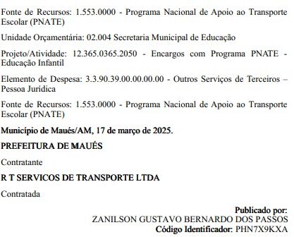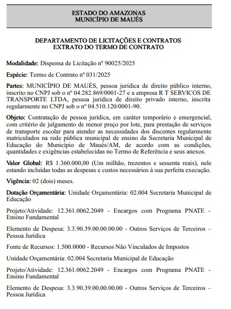 Nesta quarta-feira (2), Macelly Veras oficializou no Diário Oficial dos Municípios (DOM), um contrato com dispensa de licitação para serviços de transporte de estudantes com a empresa R.T. SERVIÇOS DE TRANSPORTE LTDA, no valor de R$ 1.360.00,00 (um milhão, trezentos e sessenta mil reais).