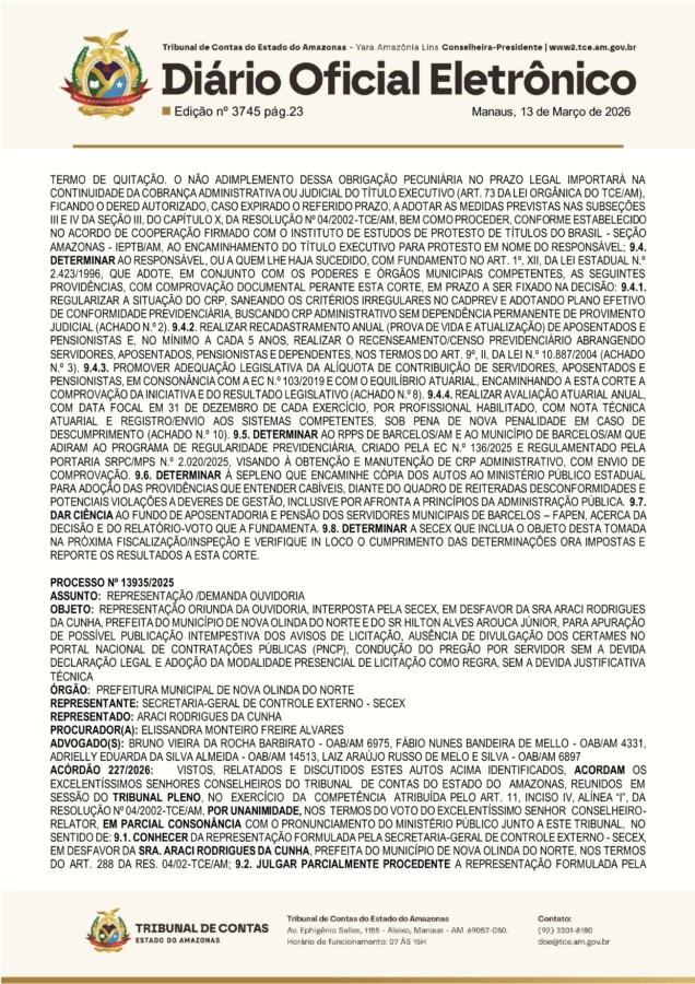 Entre as irregularidades identificadas pelo TCE-AM está a ausência de divulgação dos processos licitatórios do município no Portal Nacional de Contratações Públicas (PNCP), e a condução de pregões como a adoção da modalidade presencial de licitação sem justificativa técnica.