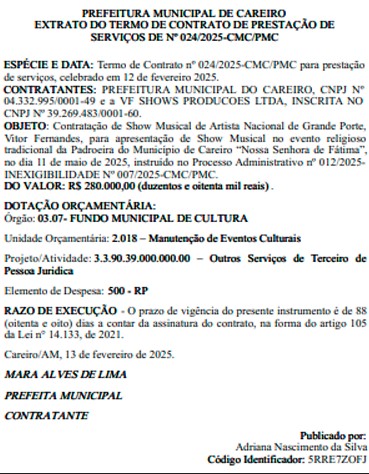 De acordo com o Diário Oficial dos Municípios (DOM), Mara Alves vai pagar R$ 280.000,00 (duzentos e oitenta mil reais), para contratar o cantor Vitor Fernandes, para um show da padroeira do município ‘Nossa Senhora de Fátima’, que ocorrerá em maio deste ano.