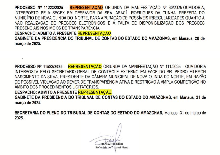 A prefeita Professora Araci Rodrigues da Cunha (MDB), e o presidente da Câmara Municipal de Nova Olinda do Norte, Pedro Filemon Nascimento da Silva (MDB), serão investigados pelo Tribunal de Contas do Estado do Amazonas (TCE-AM).