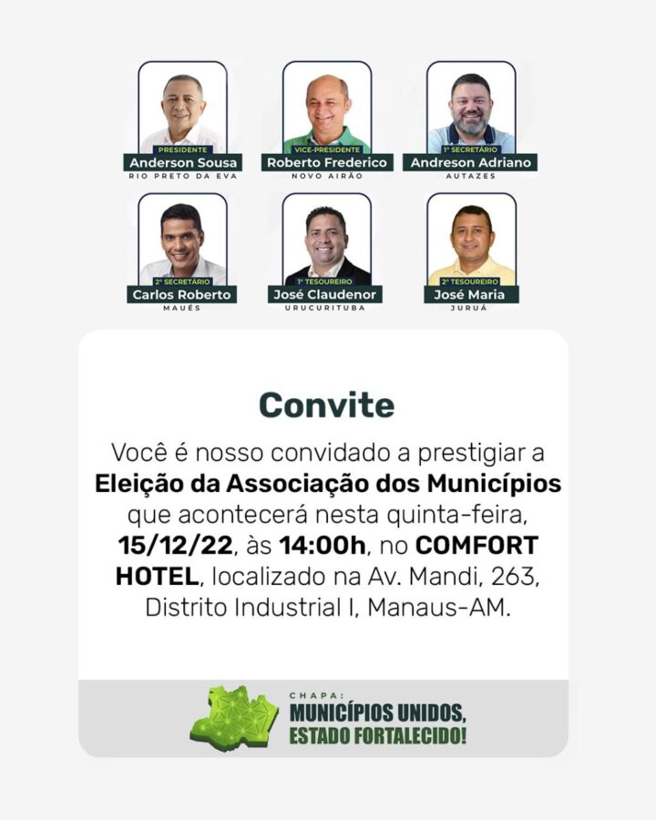 O Prefeito de Rio Preto da Eva, Anderson José de Sousa, tem a honra de convidar, os colegas e amigos da imprensa amazonense, para prestigiar a Eleição da Associação Amazonense dos Municípios (AAM) para o biênio 2023/2024, que acontecerá nesta quinta-feira (15), às 14h, no Comfort Hotel, na Avenida Mandi, 263, bairro Distrito Industrial I, em Manaus.