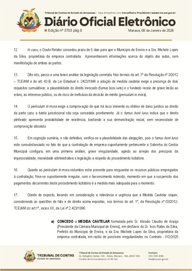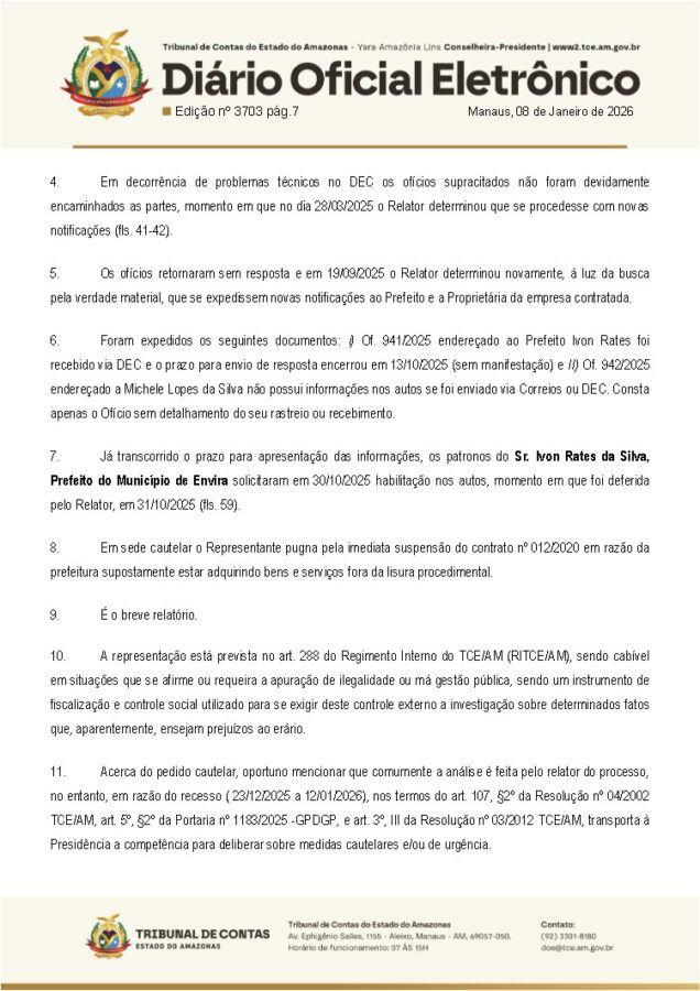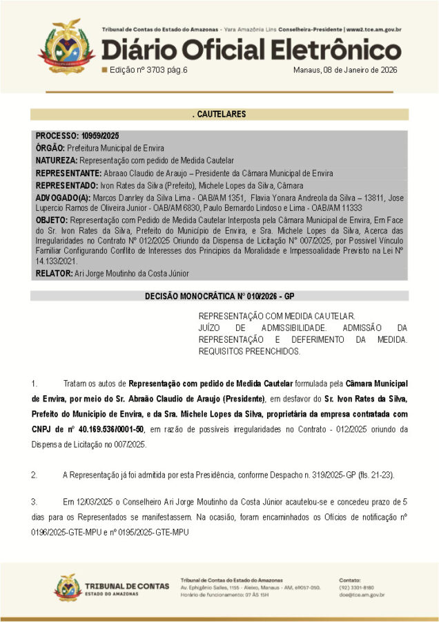 O Tribunal de Contas do Estado do Amazonas (TCE-AM) suspendeu uma licitação no município de Envira, no interior do Amazonas, por suspeitas de irregularidades na dispensa de licitação feita pelo prefeito Ivon Rates (PSD).
