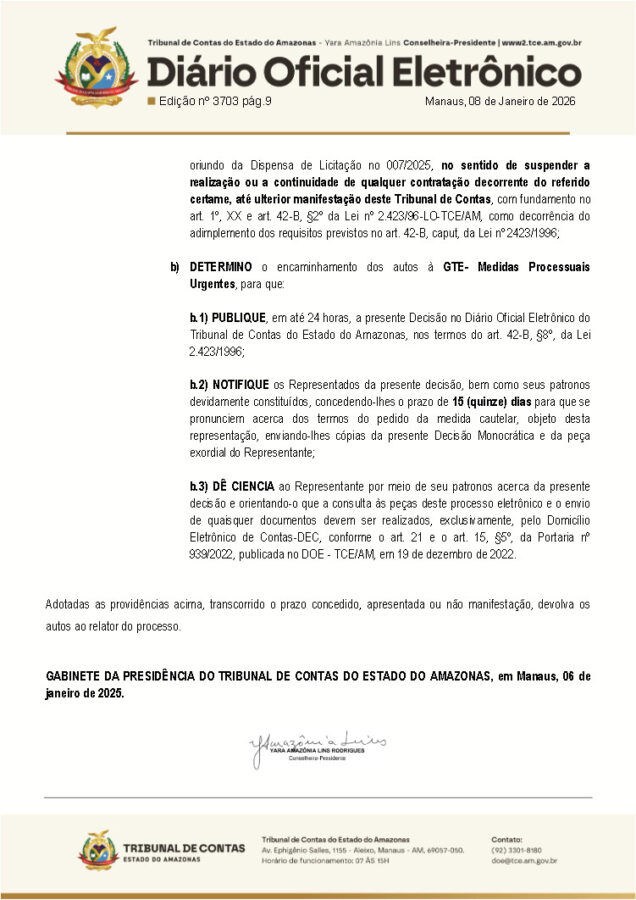O TCE-AM determinou a suspensão imediata da licitação, qualquer contratação ou pagamento decorrente ao contrato questionado até nova deliberação do órgão de contas. O conselheiro determinou um prazo para que a Prefeitura de Envira realiza os esclarecimentos necessários, com apresentação de documentos que permitam o prosseguimento da contratação.