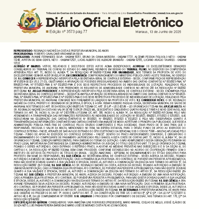 De acordo com o Diário Oficial do Órgão de Contas, Régis Nazaré foi multado em R$ 13.654,39 (treze mil seiscentos e cinquenta e quatro reais e trinta e nove centavos), por não dar transparência em licitações e cartas contratos, realizadas por ele na gestão da Prefeitura de Anori.
