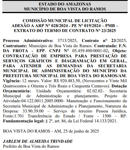 O prefeito Jarlem de Almeida mais conhecido como “Jarlem CB” (PSD), vai gastar quase R$ 1 milhão na contratação de serviços gráficos e diagramação de empresa, para atender a Prefeitura de Boa Vista do Ramos, interior do Amazonas.