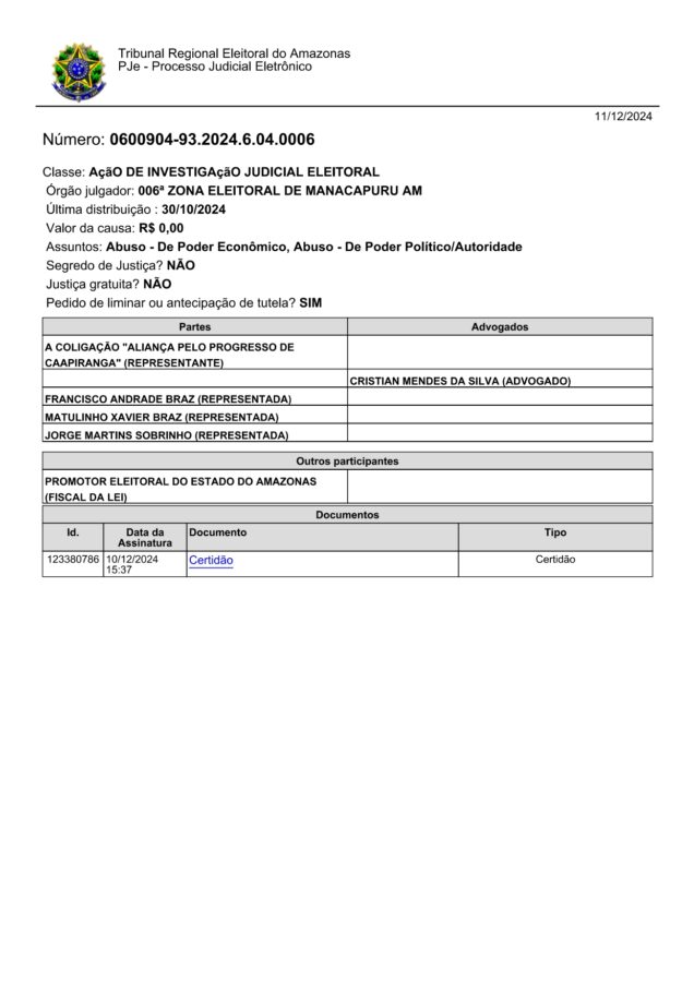 O prefeito Matulinho Xavier Braz (UB), de 23 anos, pode perder seu mandato em Caapiranga no interior do Amazonas, por conta de uma Ação de Investigação Judicial Eleitoral (AIJE), por crime de Abuso de Poder Econômico e Abuso de Poder Político, protocolado na 006ª Zona Eleitoral de Manacapuru.
