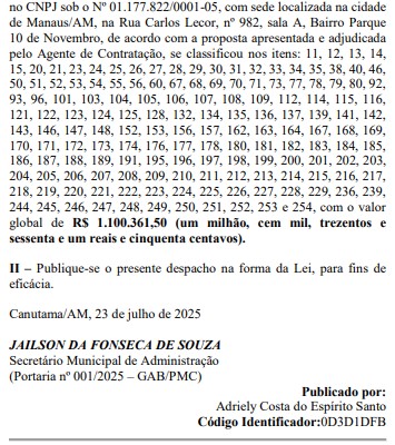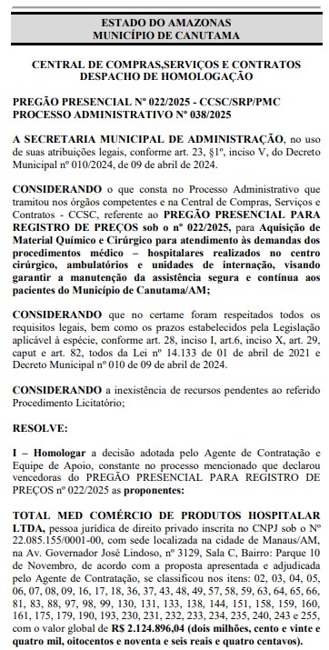 De acordo com publicação no Diário Oficial dos Municípios (DOM) desta quinta-feira (24), Zé Roberto contratou três empresas para a aquisição de material químico e Cirúrgico para atendimento às demandas dos procedimentos médico, hospitalares realizados no centro cirúrgico, ambulatórios e unidades de internação, visando garantir a manutenção da assistência segura e contínua aos pacientes do município de Canutama.