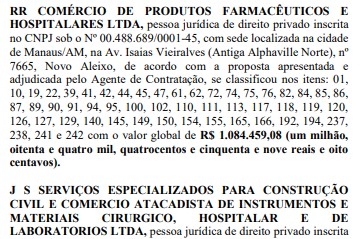 Já a empresa RR COMÉRCIO DE PRODUTOS FARMACÊUTICOS E HOSPITALARES LTDA vai ganhar R$ 1.084.459,08 (um milhão, oitenta e quatro mil, quatrocentos e cinquenta e nove reais e oito centavos).