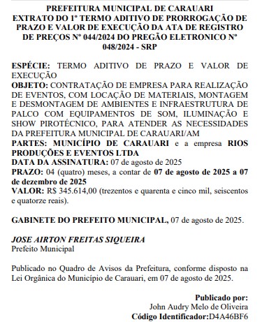 De acordo com o Diário Oficial dos Municípios (DOM), desta quinta-feira (18/09), Airton vai pagar a empresa RIOS PRODUÇÕES E EVENTOS LTDA, o valor total de R$ 345.614,00 (trezentos e quarenta e cinco mil, seiscentos e quatorze reais).