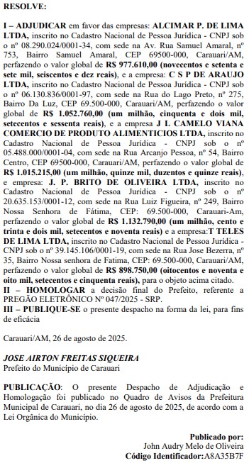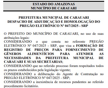 De acordo com o Diário Oficial dos Municípios (DOM), desta sexta-feira (24/11), cinco empresas devem dividir os valores de mais de R$ 5 milhões para fornecer alimentos para a Prefeitura de Carauari.