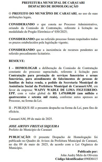 O prefeito Airton Siqueira (MDB), vai contratar uma empresa para a prestação de serviços funerários, no valor de mais de R$ 1,4 milhão em Carauari, no interior do Amazonas.