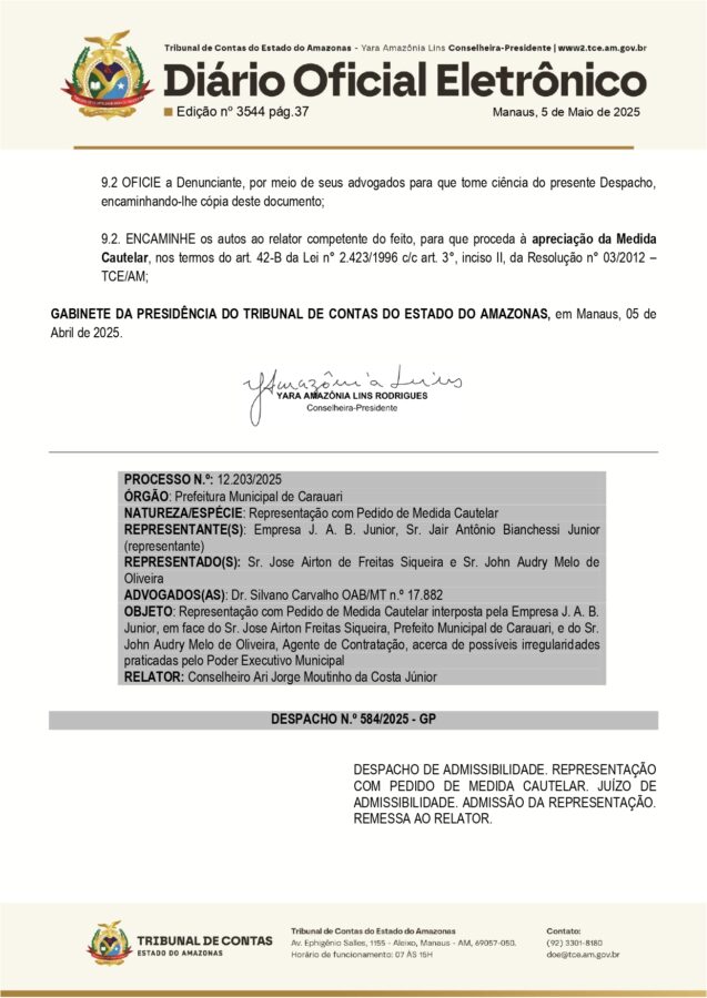 Airton Siqueira e o agente de contratação John Audrey Melo de Oliveira, deverão prestar esclarecimentos sobre o casos de diversos contratos milionários, firmados com empresas que podem causar danos aos cofres públicos da Prefeitura de Carauari.
