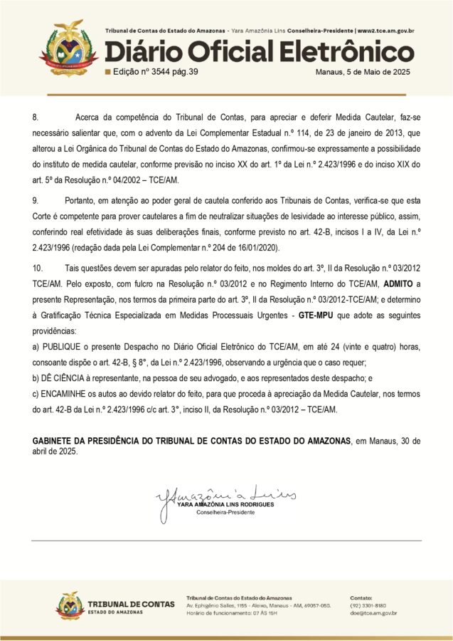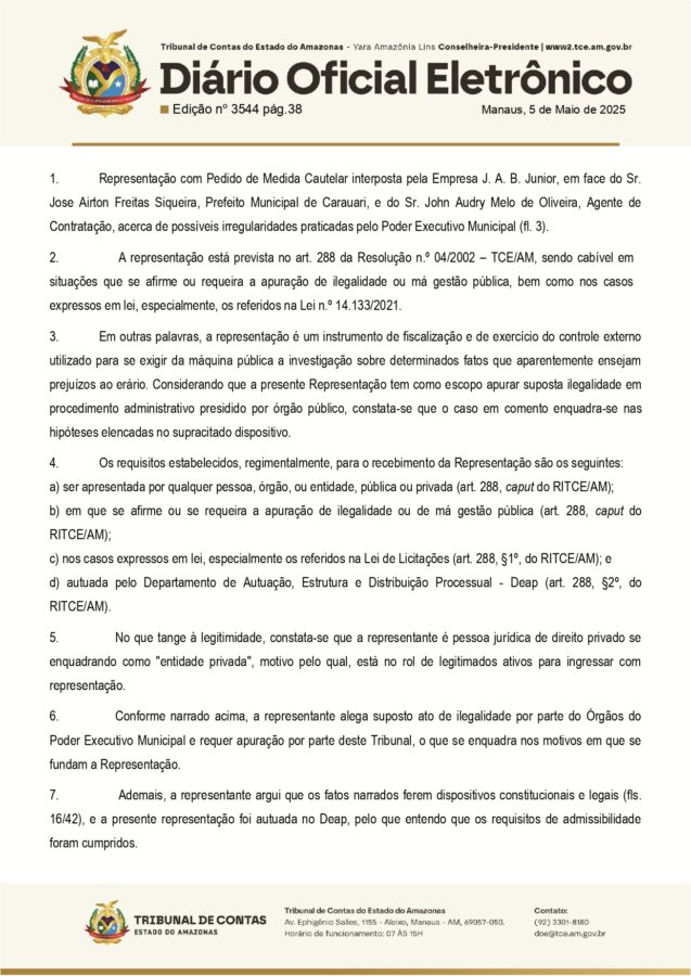 Um pedido de representação com medida cautelar foi aceito por conselheiros do TCE-AM para apurar ilegalidades e má gestão pública, em que exige fiscalização por parte do órgão, afim de evitar prejuízos ao erário público.