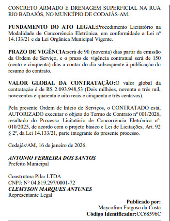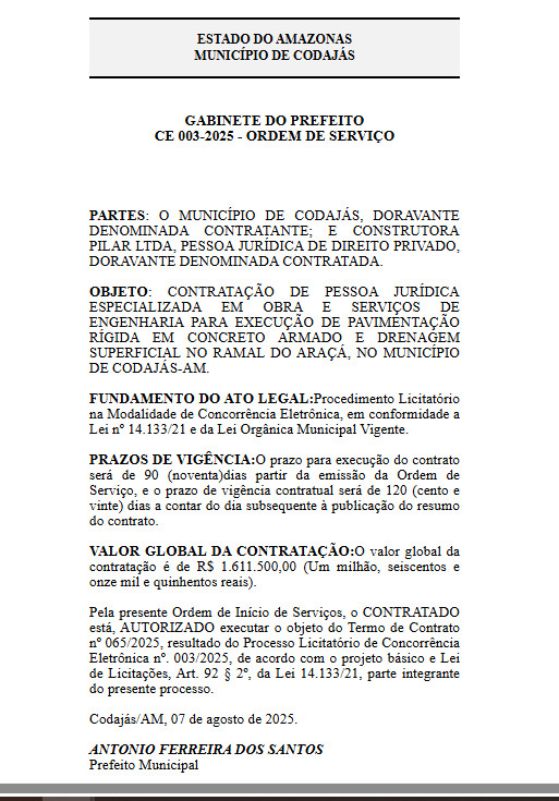 A CONSTRUTORA PILAR LTDA já havia sido contratada pelo prefeito Tonho Santos, pelo valor de R$ 1.611.500,00 (um milhão, seiscentos e onze mil e quinhentos reais), para os mesmo serviços de pavimentação em concreto armado e drenagem no Ramal do Araçá.