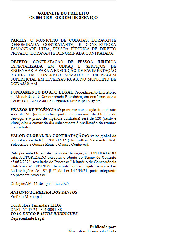 A CONSTRUTORA TAMANDARÉ LTDA, já tinha recebido da Prefeitura de Codajás o valor total de R$ 1.700.715,15 (um milhão, setecentos mil, setecentos e quinze reais e quinze centavos), para os serviços de pavimentação em concreto armado e drenagem nas ruas do município, o que dá o valor total de R$ 3.312.215,15 (três milhões, trezentos e doze mil, duzentos e quinze reais e quinze centavos), para duas empresas cuidarem da infraestrutura das ruas do município.