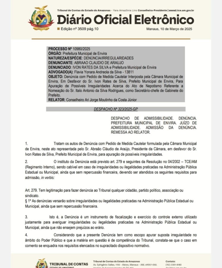 A denúncia partiu do presidente da Câmara Municipal de Envira, Abraão Cláudio de Araújo, que aponta que o prefeito Ivon Rates (PSD), contratou o seu sobrinho Antônio da Silva Rodrigues, como secreetário-chefe de seu gabinete na Prefeitura.