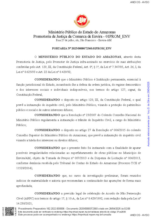 O TCE-AM aponto indícios de danos ao erário, em superfaturamento de obras de escolas municipais em Envira, solicitando ao MP-AM junto ao promotor de justiça Yury Dutra da Silva, que investigasse o prefeito.