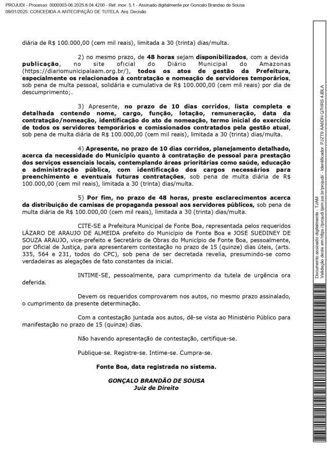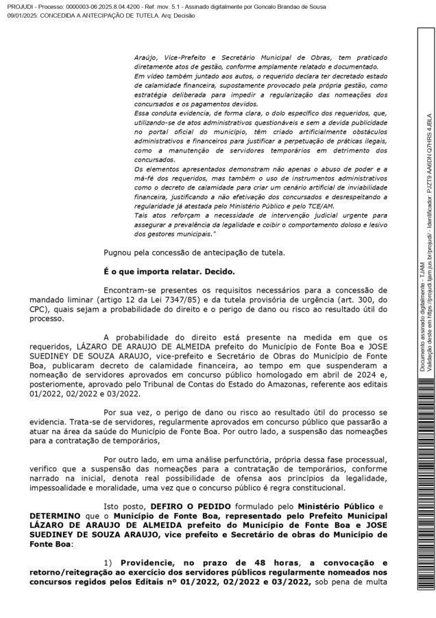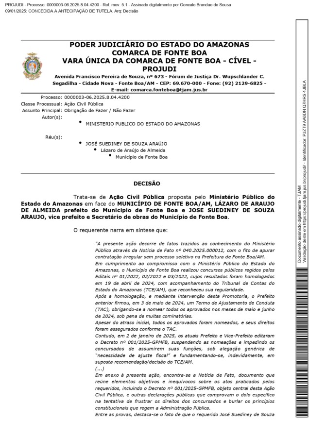 O prefeito Lázaro Araújo de Almeida, mais conhecido como “Dr. Lázaro” (Republicanos), vem ignorando uma decisão da Justiça do Amazonas, que determinou a convocação imediata dos aprovados em concurso público de 2022, no município de Fonte Boa, no interior do Amazonas.