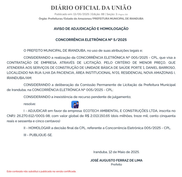 De acordo com o Diário Oficial da União (DOU) desta terça-feira (13), Ferraz contratou a ECOTECH AMBIENTAL E CONSTRUÇÕES LTDA pelo valor total e R$ 2.013.150,65 (dois milhões, treze mil, cento e cinquenta reais e sessenta e cinco centavos).