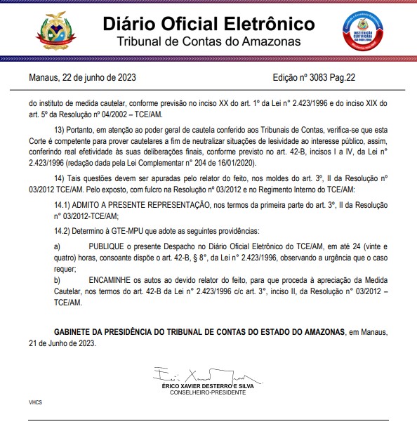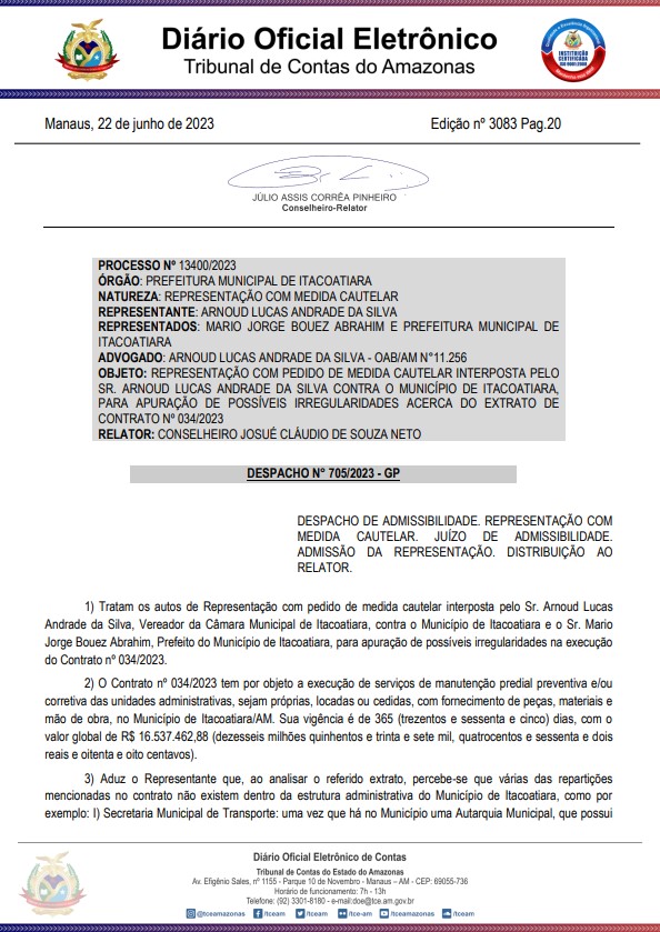 O TCE-AM vai apurar irregularidades em um contrato firmado pelo prefeito Mário Abrahim, no valor total de R$ 16.537.462,88 (dezesseis mil, quinhentos e trinta e sete mil, quatrocentos e sessenta e dois reais e oitenta e oito centavos).