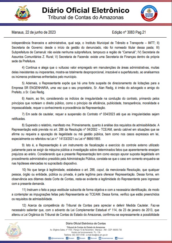 A representação cita, ainda, a suspeita de direcionamento de licitações para a empresa, que tem como proprietário Alan Reding, irmão do advogado e amigo do prefeito de Itacoatiara, Caio Reding.