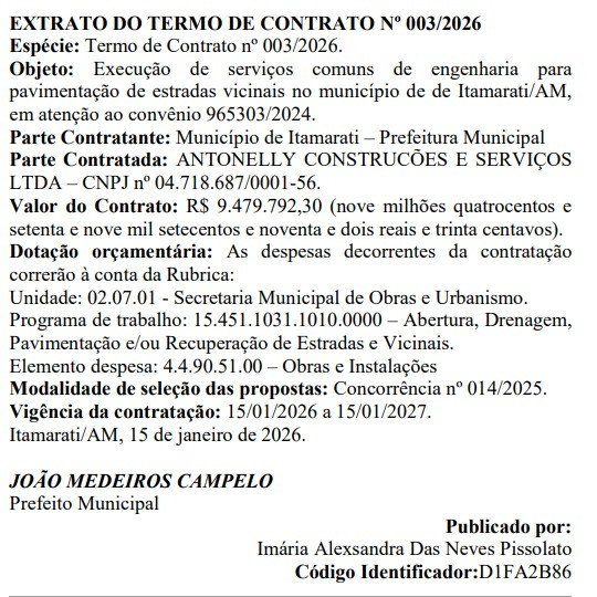 De acordo com informações do Diário Oficial dos Municípios (DOM), a Prefeitura de Itamarati contratou a empresa ANTONELLY CONSTRUÇÕES E SERVIÇOS LTDA, no valor total de R$ 9.479.792,30 (nove milhões, quatrocentos e setenta e nove mil, setecentos e noventa dois reais e trinta centavos), em serviços de pavimentação.
