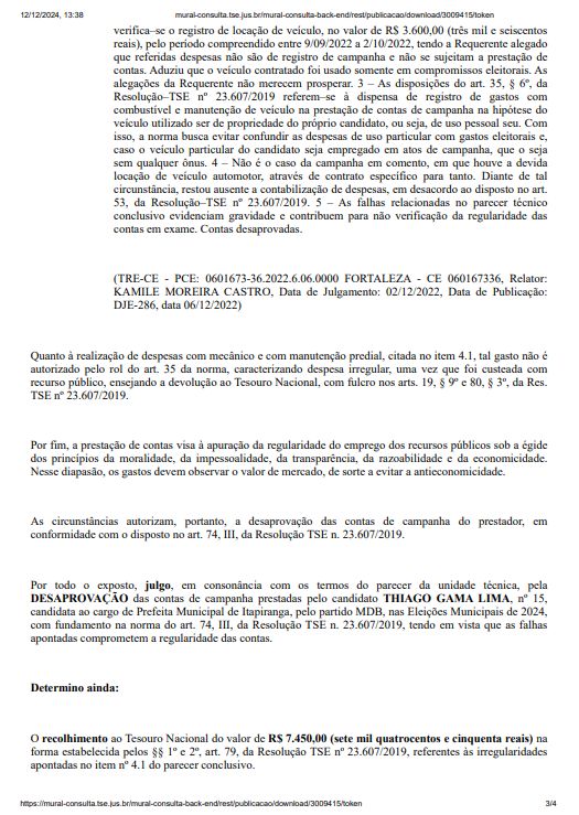 O Tribunal Regional Eleitoral do Amazonas (TRE-AM), reprovou as contas de campanha de Thiago Lima à Prefeitura de Itapiranga, por irregularidades na locação de veículos sem o correspondente gasto com combustíveis; despesas com manutenção de veículos (mecânico) no valor de R$ 4.000,00; despesas com manutenção predial em imóvel locado no valor de R$ 3.450,00; locação de veículos (motos) com valores praticados fora do mercado.