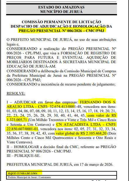O prefeito Ilque Cunha (MDB)vai gastar R$ 3,4 milhões para adquirir mobiliários para atender a Secretaria Municipal de Educação (Semed) de Juruá, no interior do Amazonas.