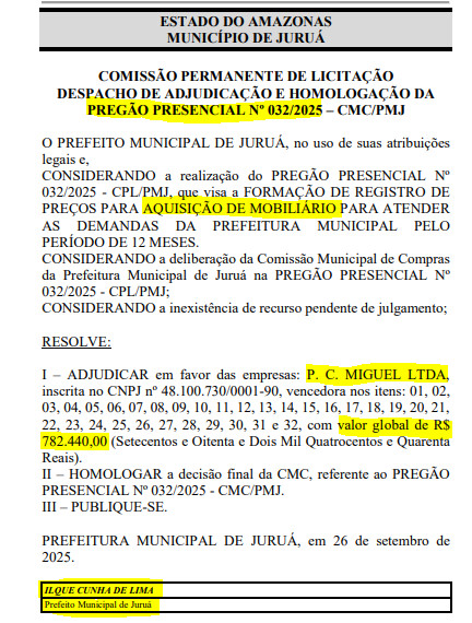 O que chama atenção nessa contratação é que o prefeito Ilque Cunha já havia contratado a empresa P.C. MIGUEL LTDA pelo valor de R$ 782.440,00 (setecentos e oitenta e dois mil, quatrocentos e quarenta reais), para adquirir mobiliário por doze meses.