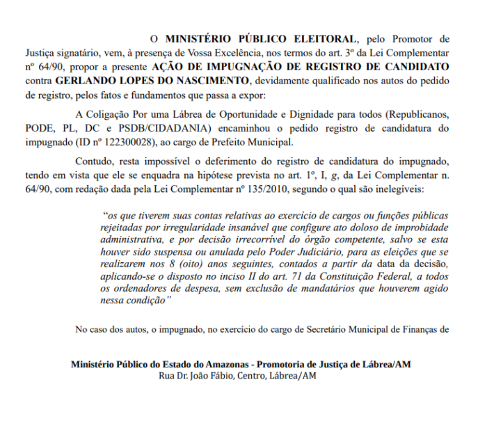 O Ministério Público Eleitoral (MPE) pediu ao Tribunal Regional Eleitoral do Amazonas (TRE-AM), por meio de ação de impugnação de registro de candidatura, a cassação de Gerlando Lopes (PL) na disputa pela prefeitura do município de Lábrea nas eleições de 2024.