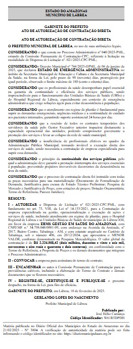 O prefeito Gerlando Lopes do Nascimento (PL), contratou com dispensa de licitação, uma empresa para gerir e operacionalizar as Unidades Básicas de Saúde e o Hospital Regional de Lábrea, por mias de R$ 2,2 milhões.