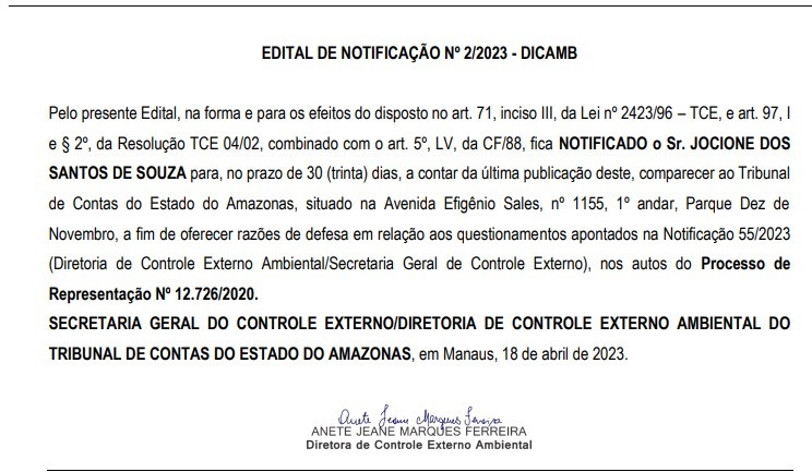 “…fica NOTIFICADO o Sr. JOCIONE DOS SANTOS DE SOUZA para, no prazo de 30 (trinta) dias, a contar da última publicação deste, comparecer ao Tribunal de Contas do Estado do Amazonas, a fim de oferecer razões de defesa em relação aos questionamentos apontados na Notificação 55/2023 (Diretoria de Controle Externo Ambiental/Secretaria Geral de Controle Externo), nos autos do Processo de Representação Nº 12.726/2020”, diz a notificação.