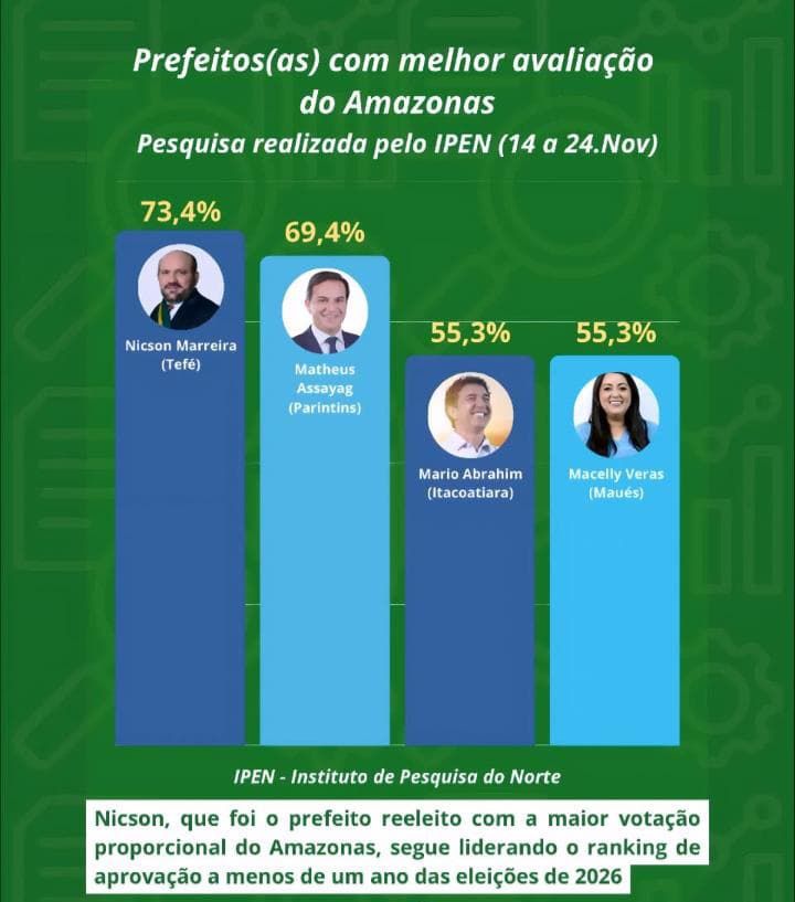 O município de Tefé voltou a ganhar protagonismo no cenário estadual. De acordo com a pesquisa realizada pelo Instituto de Pesquisa do Norte (IPEN) entre os dias 14 e 24 de novembro, o prefeito Nicson Marreira alcançou 73,4% de aprovação, tornando-se o prefeito mais bem avaliado do Amazonas.