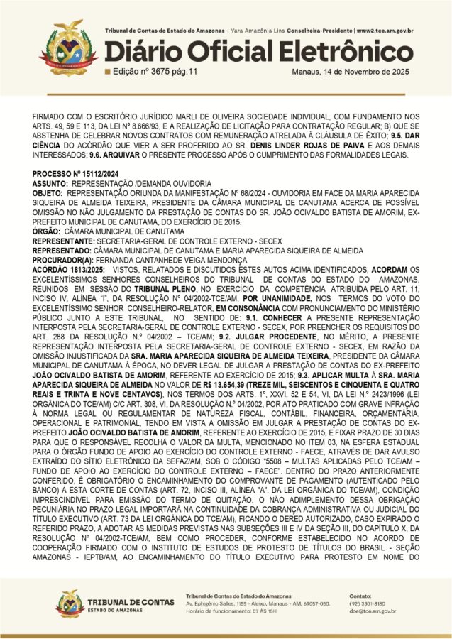 O prefeito de Atalaia do Norte, Denis Linder Rojas de Paiva (UB), foi multado em R$ 13.654,39 pelo Tribunal de Contas do Estado do Amazonas (TCE-AM), devido a irregularidades identificadas na contratação de serviços jurídicos realizados por inexigibilidade de licitação, sem comprovação dos requisitos legais exigidos.