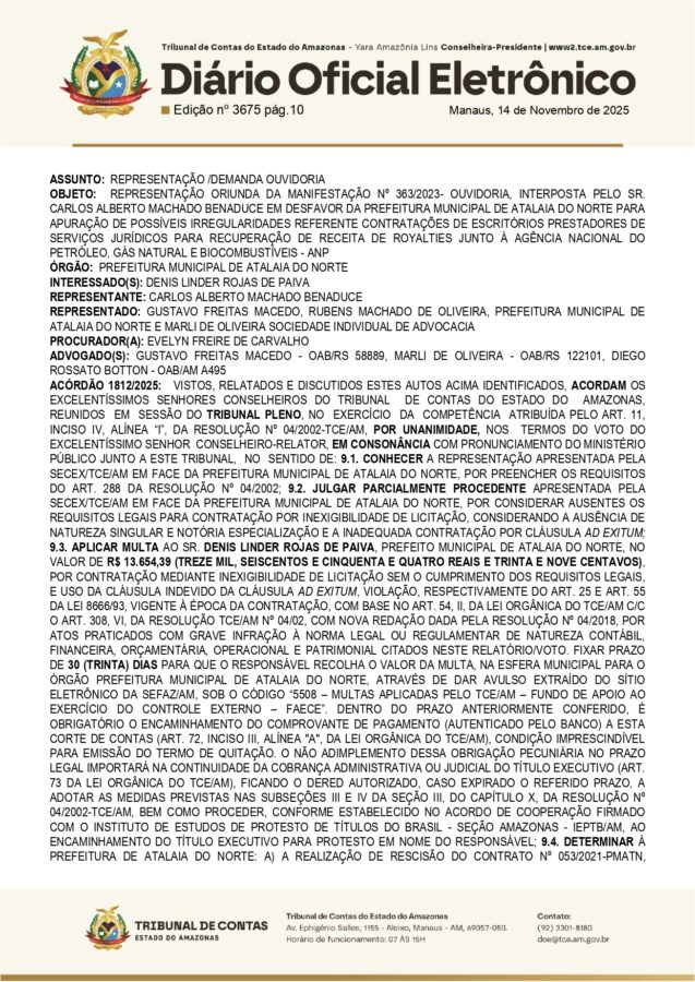 O prefeito de Atalaia do Norte, Denis Linder Rojas de Paiva (UB), foi multado em R$ 13.654,39 pelo Tribunal de Contas do Estado do Amazonas (TCE-AM), devido a irregularidades identificadas na contratação de serviços jurídicos realizados por inexigibilidade de licitação, sem comprovação dos requisitos legais exigidos.