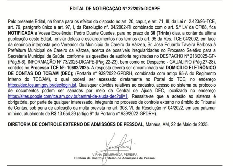 O prefeito Pedro Guedes (PSD), tem 30 (trinta) dias para apresentar sua defesa ao Tribunal de Contas do Estado do Amazonas (TCE-AM), sobre uma denúncia de irregaridades em um processo seletivo para a àrea da saúde do Careiro da Várzea, interior do Amazonas.