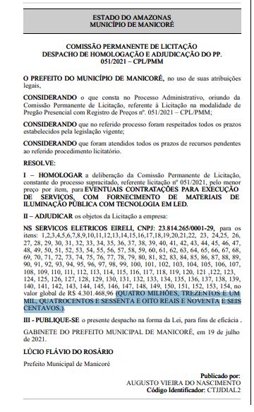 No documento, consta como vencedora do procedimento de licitação a empresa NS Serviços Elétricos Eirelli, de CNPJ 23.814.265/0001-29, que eventualmente pode ser contratada pela prefeitura, pelo valor de R$ 4.301.468,96 (quatro milhões, trezentos e um mil, quatrocentos e sessenta e oito reais e noventa e seis centavos).