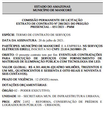 De acordo com o documento, a empresa contratada foi a NS Serviços Elétricos Eirelli, de CNPJ 23.814.265/0001-29, que venceu o procedimento de licitação, como noticiado anteriormente. A empresa vai faturar o valor de R$ 4.301.468,96 (quatro milhões, trezentos e um mil, quatrocentos e sessenta e oito reais e noventa e seis centavos).